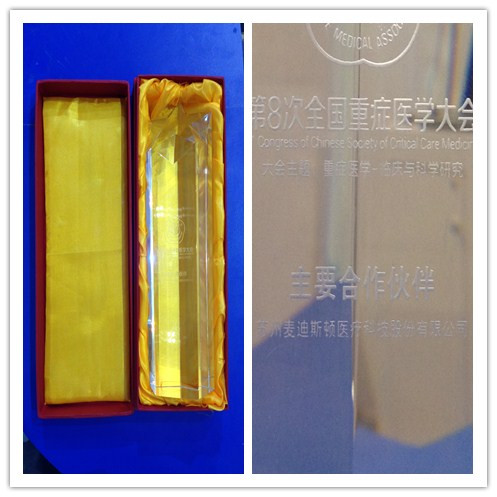 在大会的期间,组委会还给我们颁发了“全国重症大会—主要合作伙伴”的奖杯,这是对我们公司在危重症医学上做出的成绩给予的肯定。