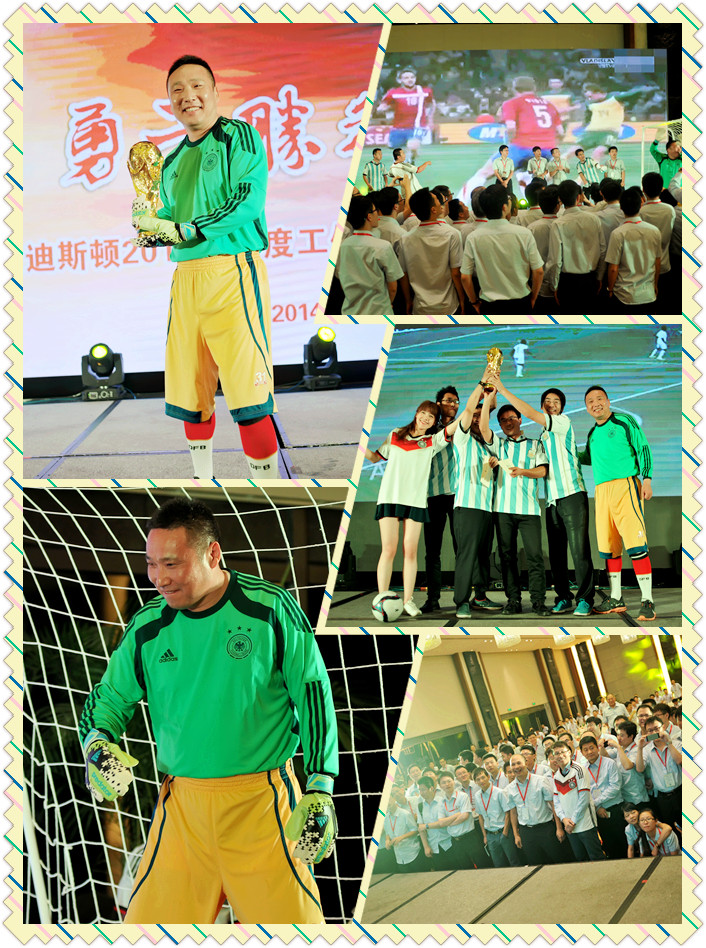 此次半年会恰逢世界杯决赛之际,麦迪世界杯也在晚宴现场激烈开赛。表演完毕道具组将球框搬上舞台。比赛现场按部门分为6个小分队,抽签完毕,各个队员迅速换装,一场“阿根廷”和”德国“队的点球对决正式开始。守门员翁总身着德国队战袍压轴亮相,引起现场一阵哗然。经过一轮淘汰赛的比拼,剩下的三个分队使出浑身解数,争夺冠军席位,最终技术中心代表队一举夺冠,获得翁总亲自颁发的大力神杯。