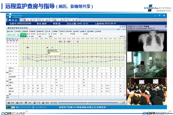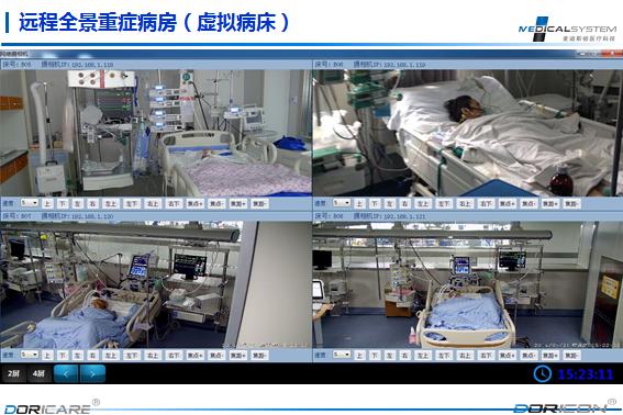 远程重症监护室,通过集成病房全景视频和患者体征波形数据等提供全景病房远程监护服务,实现患者床边数据自动采集、重症患者的数据集成、重症科室文书电子化、音视频双向交互,实现患者数据的统一提取与存储,提供高级扩展应用,如临床监测和预警、医疗质量监控等。