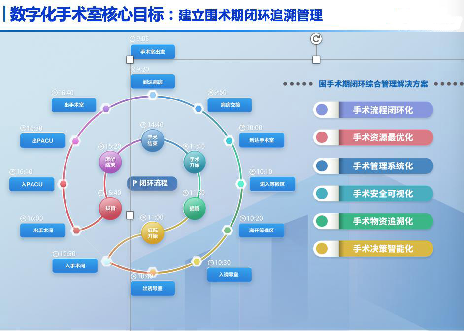 数字化手术室的整体规划及设计越来越测重于围手术期闭追溯综合管理,真正做到手术流程闭环化,手术资源最优化,手术管理系统化,手术安全可视化,手术物资追溯化,手术决策智能化。