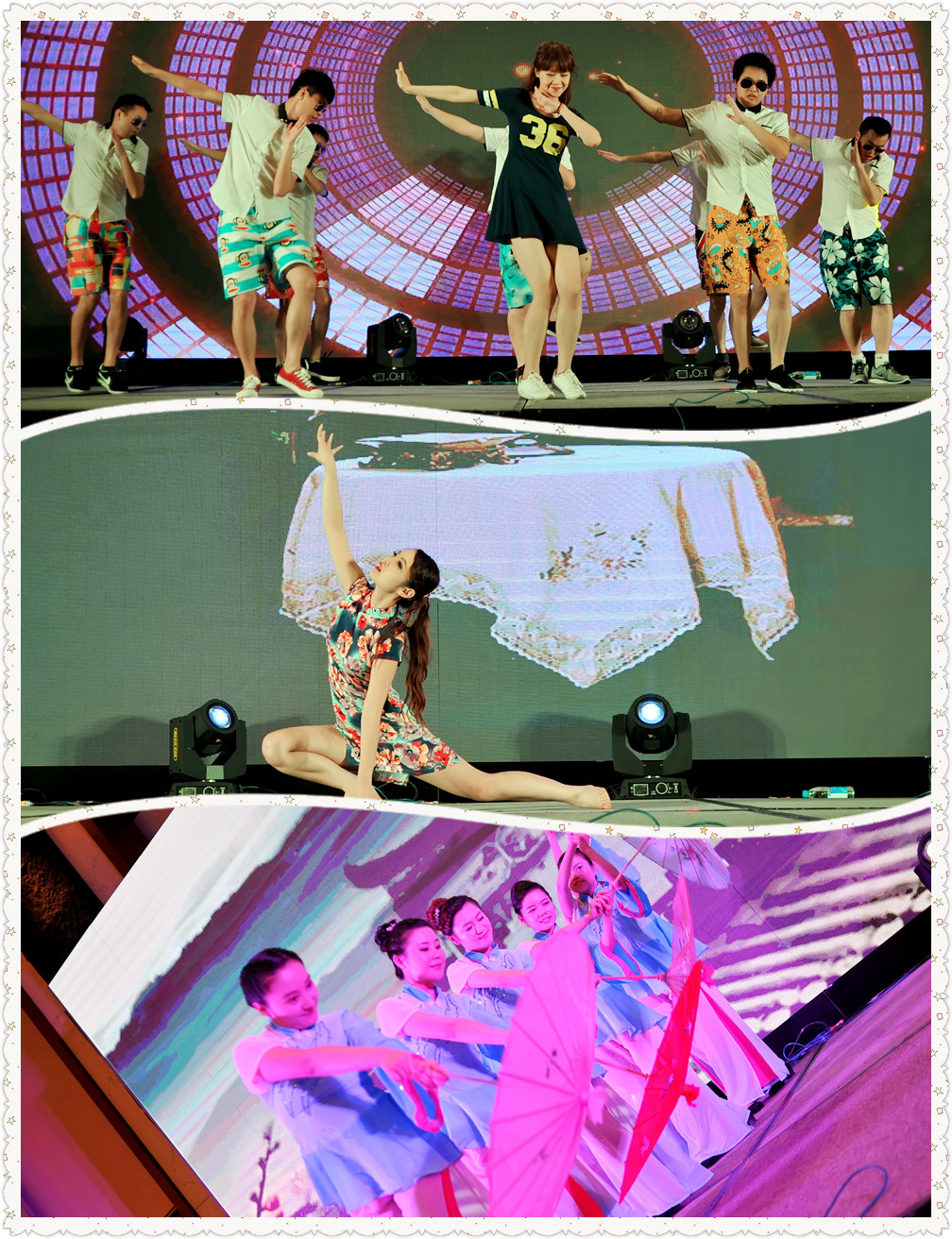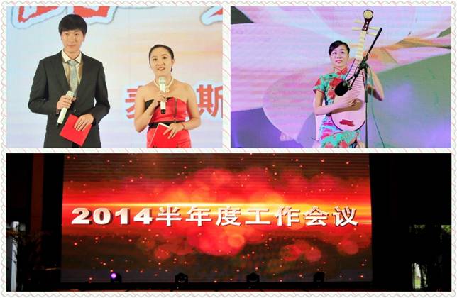 歌曲演唱,风格各异:《牛仔很忙》欢快活泼;《江南》悠扬动听;《奔跑》青春洋溢,《shall we talk》娓娓道来;《你到底爱不爱我》深情款款……舞蹈演出更是多姿多彩:《彩云追月》婀娜多姿,韵味十足;《情深深雨蒙蒙》衣袂飘飘、舞姿曼妙;技术中心的同事紧随时尚潮流,将一夜之间红遍大江南北的舞蹈《小苹果》搬上才艺表演舞台,动感的旋律,欢快的舞姿将现场气氛推至一个小高潮。华东销区的许奕更是别出心裁,在大家开怀畅饮之时,演唱一首《新贵妃醉酒》,博得现场一阵阵掌声。工会主席罗建铭携张云着红军服入场,深情演绎了一首《十送红军》,与公司井冈山旅游研讨会场景相得益彰。行政办马莹及搭档带来的小品《伞兵,我们等你回来》精湛的演技,感人肺腑的内容,催的现场观众潸然泪下。人力资源部王挺与总经办朱羽奇默契合作,用手风琴伴奏,深情演唱一首《同桌的你》,又将大家的记忆带回到青涩美好的年代。华南销区新员工带来的《明天你好》让我们看到了麦迪斯顿朝气蓬勃的力量与希望!